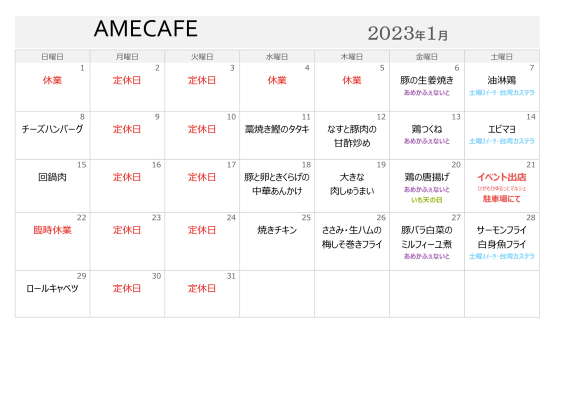 今月の気まぐれランチカレンダー(日替わりランチ)です。