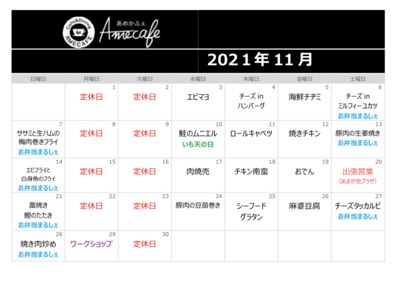 そして10月の気まぐれランチ(日替わりランチ)カレンダーです。