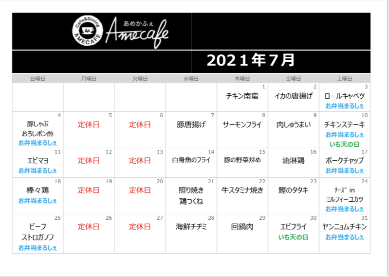 7月の気まぐれランチ(日替わりランチ)のカレンダーです!