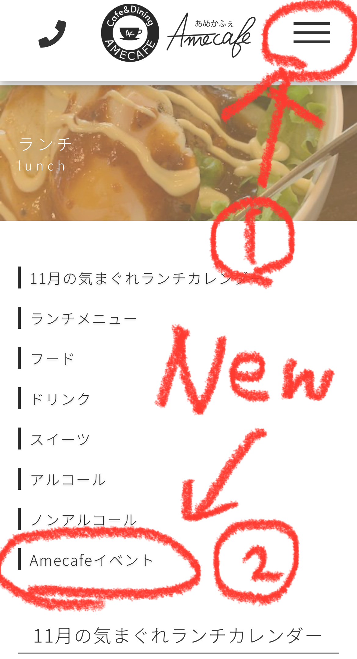 ホームページ右上の【3本線】から【ランチ】を選択すると今月のイベント情報を発信しております!